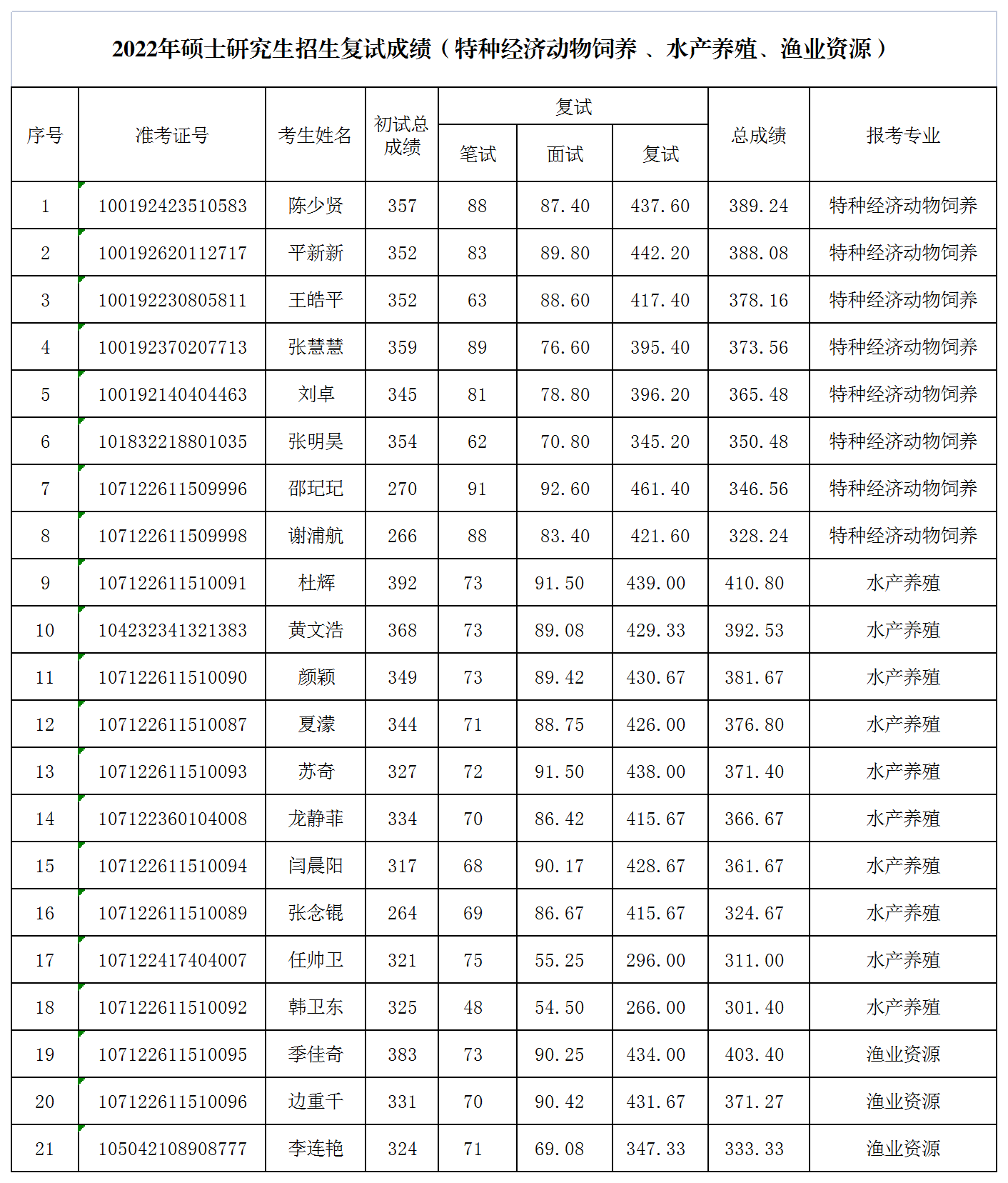 根据《西北农林科技大学关于做好2022年硕士研究生招生录取工作的通知》《性吧 关于做好2022年硕士研究生招生复试录取工作的通知》等文件精神,性吧 通过专业课笔试、面试等复试环节考核,经性吧 研究生招生工作领导小组复核,现将性吧 2022年特种经济动物饲养、水产养殖、渔业资源等专业硕士研究生招生复试成绩予以公示(见附件)。