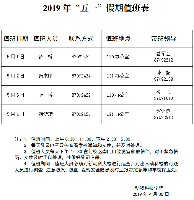 » 2019年“五一”假期值班表
