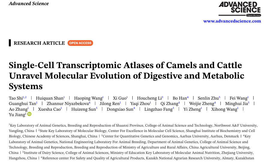 近日,性吧 动物大数据与功能基因组团队姜雨教授课题组在国际期刊《Advanced Science》在线发表题为“Single-Cell Transcriptomic Atlases of Camels and Cattle Unravel Molecular Evolution of Digestive and Metabolic Systems”的研究论文。该研究通过构建骆驼与奶牛多组织单细胞转录组及空间转录组图谱,系统揭示了多胃动物在消化、代谢与肾脏系统中的细胞层面进化创新,为理解环境适应性演化及家畜性状定向改良提供了全新的理论框架与细胞靶点。
