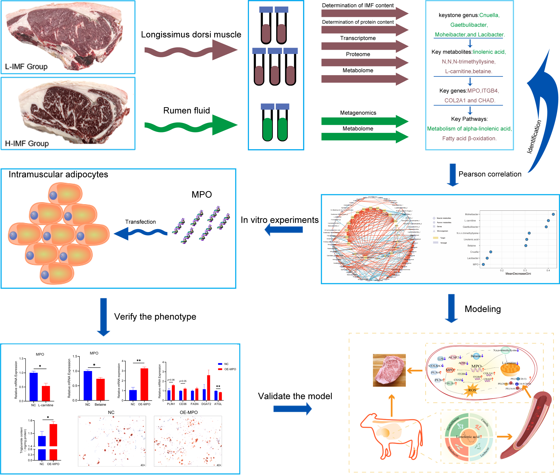 肌内脂肪(IMF)含量是决定牛肉大理石花纹、嫩度和风味的核心指标,直接影响牛肉的市场价值。我国地方黄牛品种以耐粗饲、抗逆性强、肉质细嫩而著称,但瘤胃微生物-宿主互作在肌内脂肪沉积中的协同作用及潜在分子机制未被解析。针对这一关键科学问题,研究团队以地方牛品种郏县红牛为研究对象,构建 “宏基因组+代谢组+ 转录组+蛋白质组” 的多组学研究体系,结合体外细胞验证,开展了系统性研究(图1)。